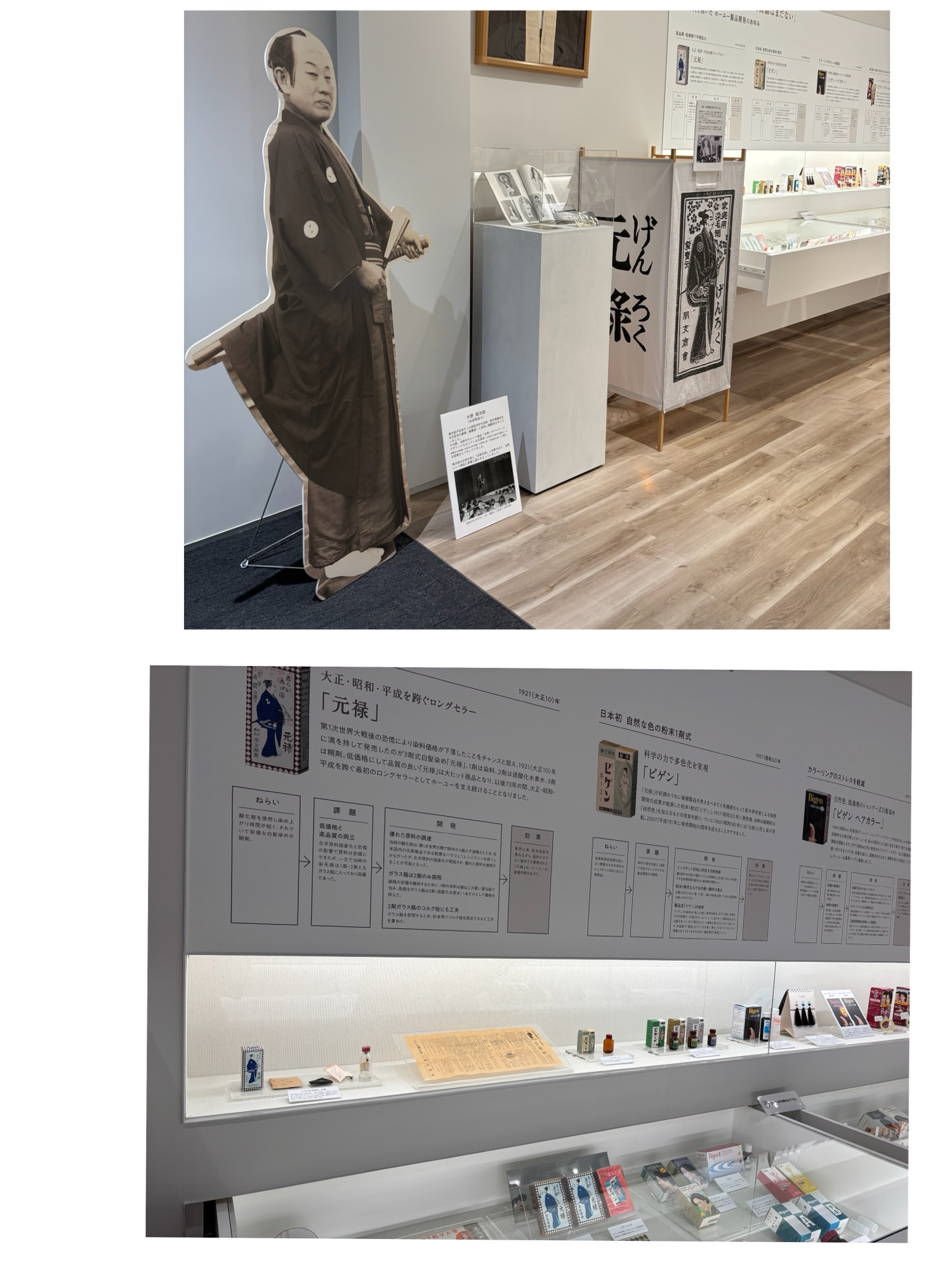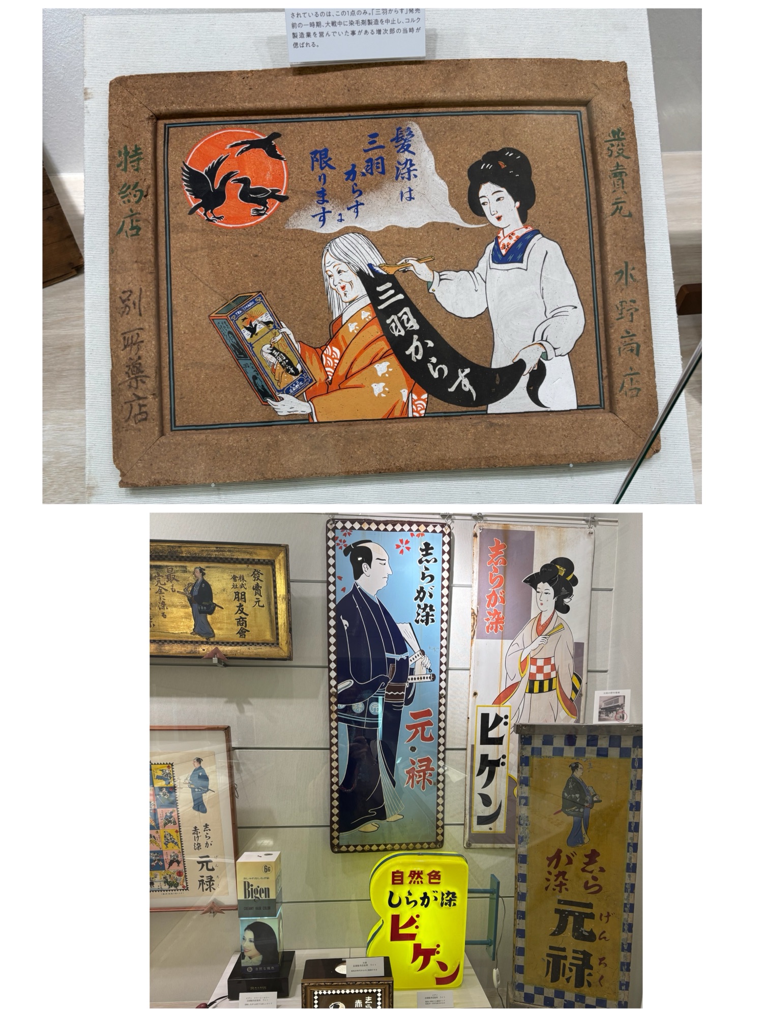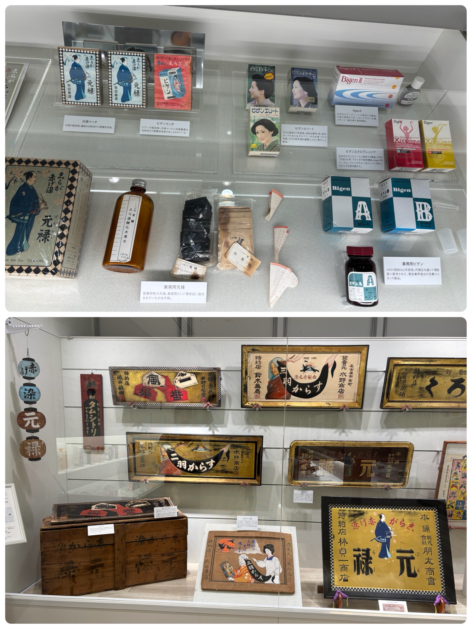 からの、昔の看板や、当時の黒染めの、粉末カラー剤など、沢山展示されておりました。