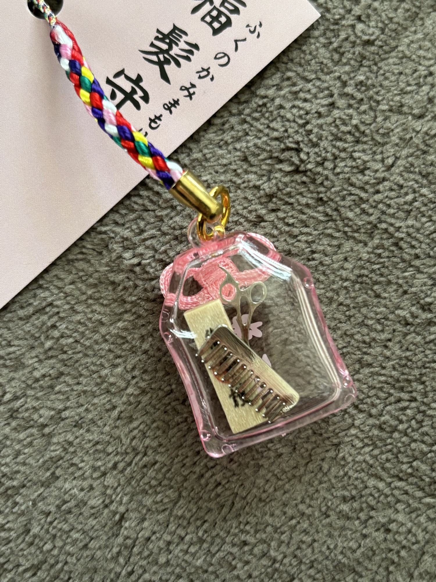 中に、コームとシザーが入ってる可愛いお守り(これの白色をお客様にいただいて、お店に飾らせていただいてるので、見たのことある方もみえますよね?!笑)